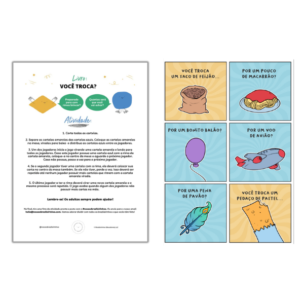 No Kit do mês, enviamos duas atividades educativas voltadas a abordar algum aspecto da história ou do conteúdo de cada livro. As atividades são divertidas, não necessariamente didáticas, mas sempre em português, e as crianças adoram. As propostas variam entre brincadeiras, jogos e atividades artísticas, todas com o intuito de serem acessíveis a todas as idades. E o suspense de quais serão as atividades do mês seguinte estimula as crianças.